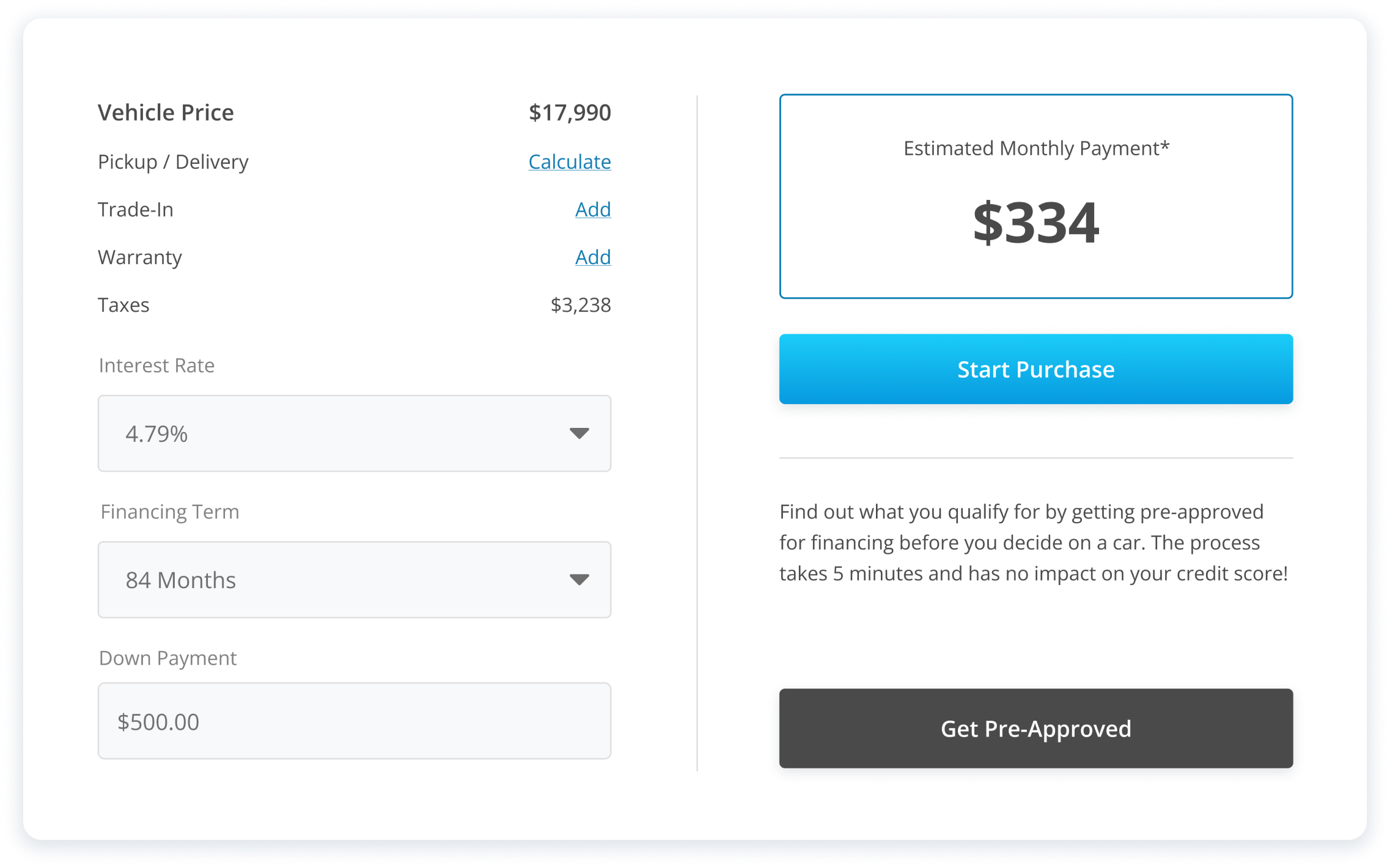 The pre-approval process is a fast and convenient 2-minute online procedure that informs customers of their potential approval amount without any impact on their credit scores.